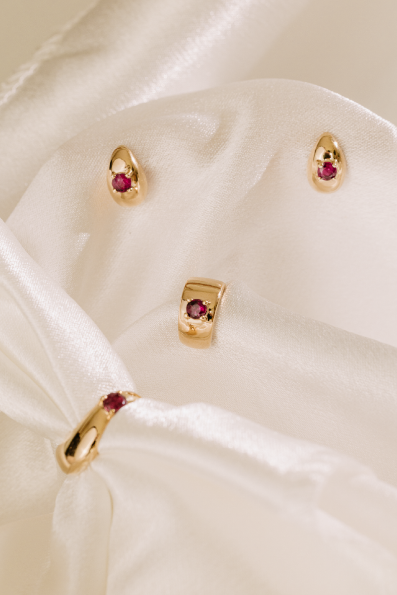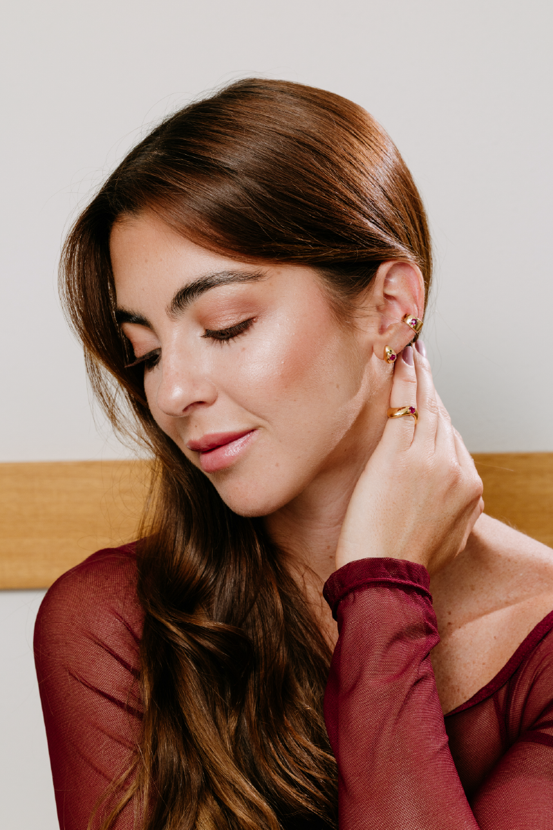 The Eclipse Earcuff is a sleek and stylish piece featuring a vibrant ruby, designed to add a subtle sparkle along the edge of your ear. Available in your choice of gold color, it can be easily paired with other jewelry for a layered look. Small yet striking, it brings a touch of modern elegance to any outfit.